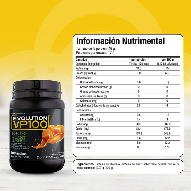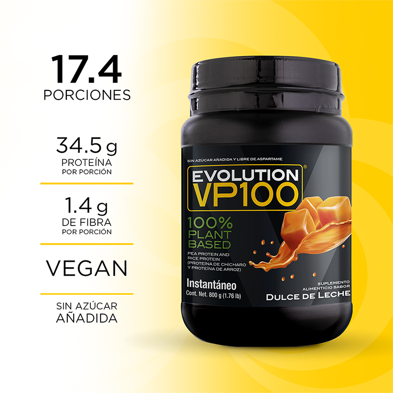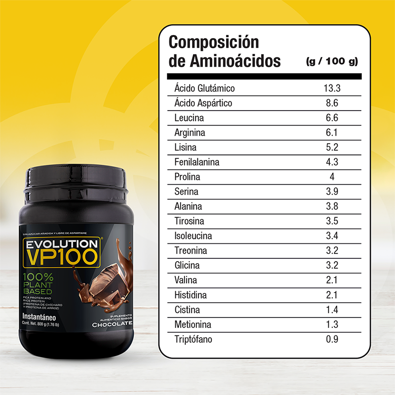 La proteína vegetal VP100 EVOLUTION está hecha a base de chícharo y de arroz. Es una proteína completa que contiene todos los aminoácidos, por ser una combinación de diferentes fuentes de proteína vegetal .