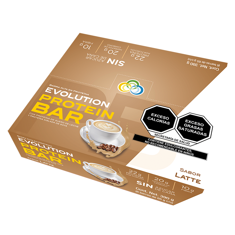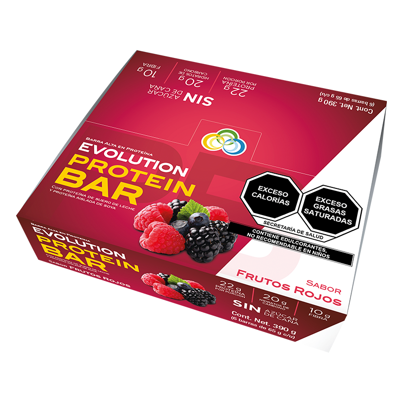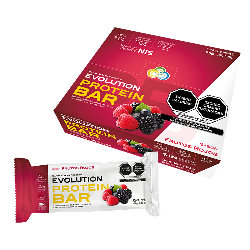 Las Barras de Proteína EVOLUTION es un alimento con alto aporte proteico conformado por proteínas altamente biodisponibles, carbohidratos de fácil digestión y grasas. La barra de proteína de 65 gramos es una combinación de suero de leche y soja las cuales tienen todos los aminoácidos que el cuerpo requiere.